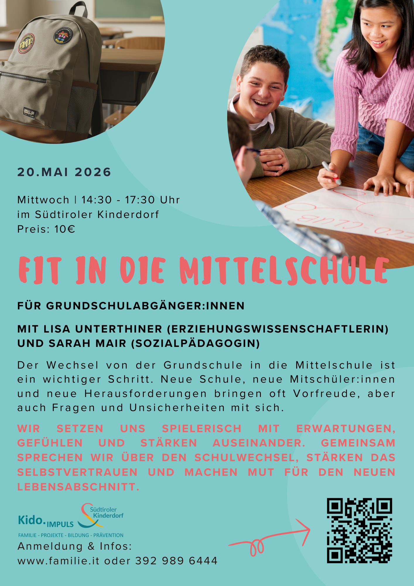Wir setzen uns spielerisch mit Erwartungen, Gefühlen und Stärken auseinander. Gemeinsam sprechen wir über den Schulwechsel, stärken das Selbstvertrauen und machen Mut für den neuen Lebensabschnitt.